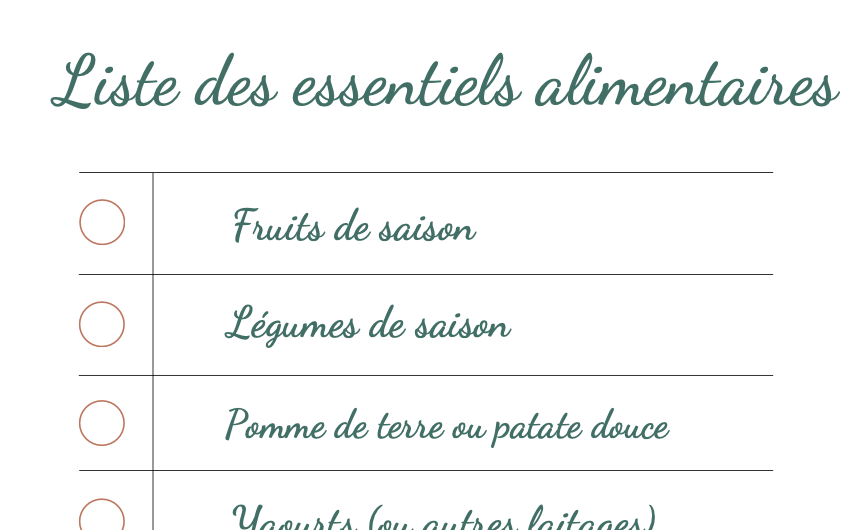 Téléchargez la liste des essentiels alimentaires Une liste de courses hebdomadaire qui regroupe tous les produits de base simples et sains à mettre dans son panier.